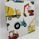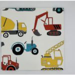 ショベルカーやトラックなど、はたらく車をモチーフにした、楽しくリズミカルなデザイン。シンプルな色使いと親しみやすいフォルムが、空間に明るさと遊び心を添えます。